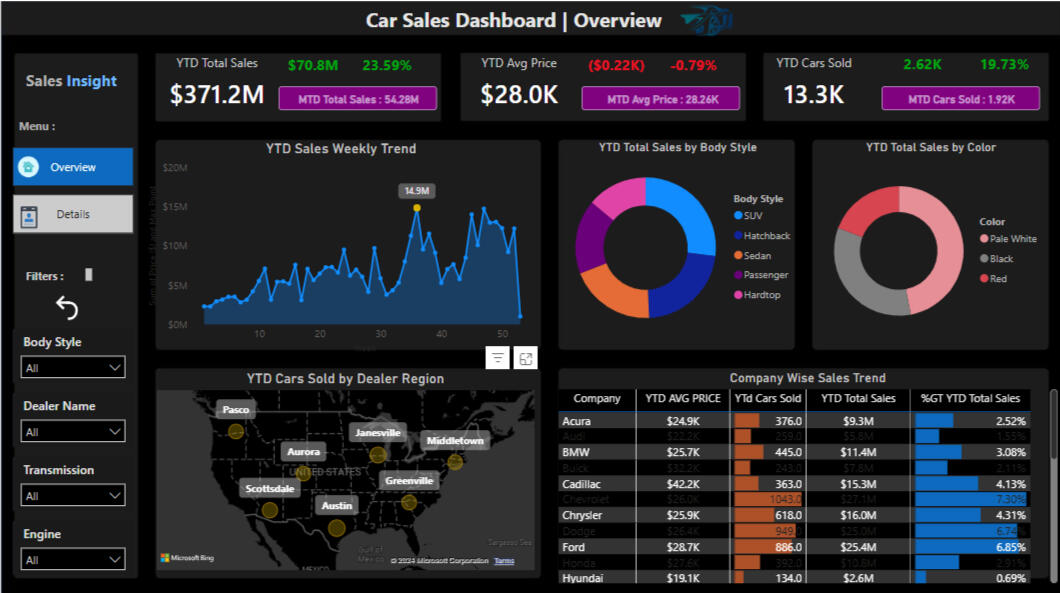 Visualisierung: Gestaltung der wichtigsten KPI-Visualisierungen (Gesamtverkäufe, Durchschnittspreis, Verkaufsvolumen) und Filtermöglichkeiten (z. B. nach Karosseriestil, Region).